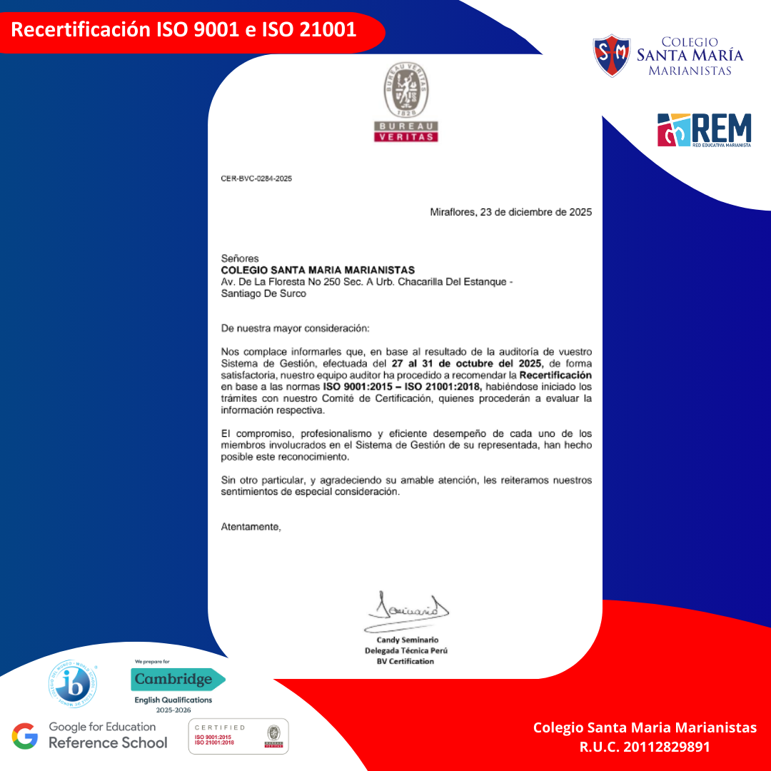 Nos llena de orgullo compartir con toda nuestra comunidad que el Colegio Santa María Marianistas ha recibido la recomendación para la recertificación de nuestros sistemas de gestión ISO 9001 e ISO 21001 para el periodo 2026-2028.